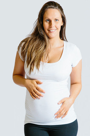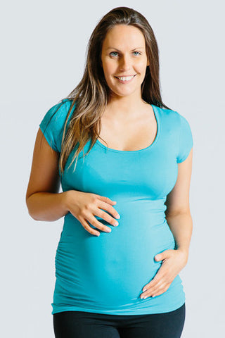A staple for any maternity wardrobe. This simple t shirt has ruched sides to accommodate your growing belly. Made from super soft stretch fabric, this will be one of your favourite pieces to wear. Available in Black, White, Teal and Red. Great on it's own in the summer, or throw a cardi over it for the cooler days.