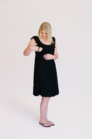 For day and evening elegance go for simple shapes and stunning details. The soft nature of the material allows for both comfortable and convenient wear for any occasion. The elegant chiffon pleated collar adds a classic touch to this versatile style. This sleeveless dress has a second layer that opens at the center front for easy nursing. It is designed to suit all shapes and figures, and looks good with or without a belt. Made from stretchy fabric that is designed to grow with you.åÊ