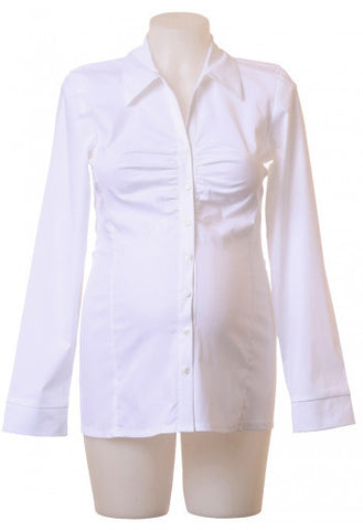 Our Classic Work shirt is made in Cotton Elastane and features flattering gather detail at the bust line for optimal stretch and shape. Classic Tailoring ensure this style is an ideal wardrobe staple that is both comfortable and professional. Style this with our Best Selling Suiting Pants and skirts for an instant office look, or team with Denim and flats for a conservative and crisp day look.
