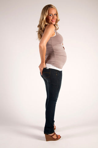 Denim in a skinny leg style. Made from super soft stretch denim, these jeans are designed to fade and have a worn in look. Featuring a soft stretch knit tummy panel, and belt loops so they can be worn after baby has arrived.