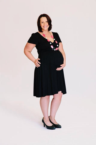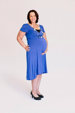 Plus Size Maternity dress, with cross over V front and back, featuring an under bust belt with satin trim in soft rayon/spandex knit. This versatile dress is suitable for breastfeeding and can be worn as a smart casual day dress and out for evening wear. Available in black and royal blue.